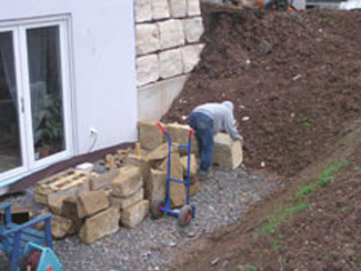 im Garten und haben uns ungefähr 20 Tonnen Bruchsteine